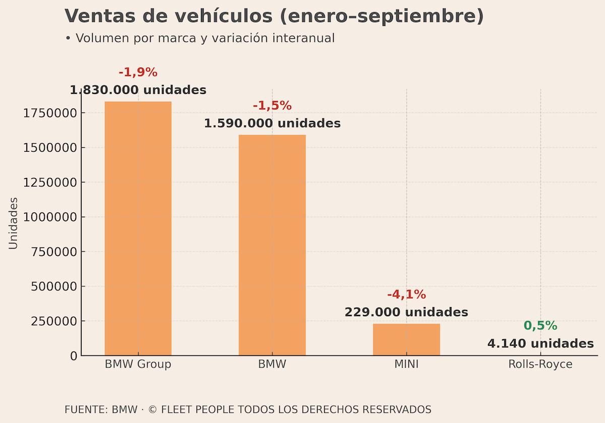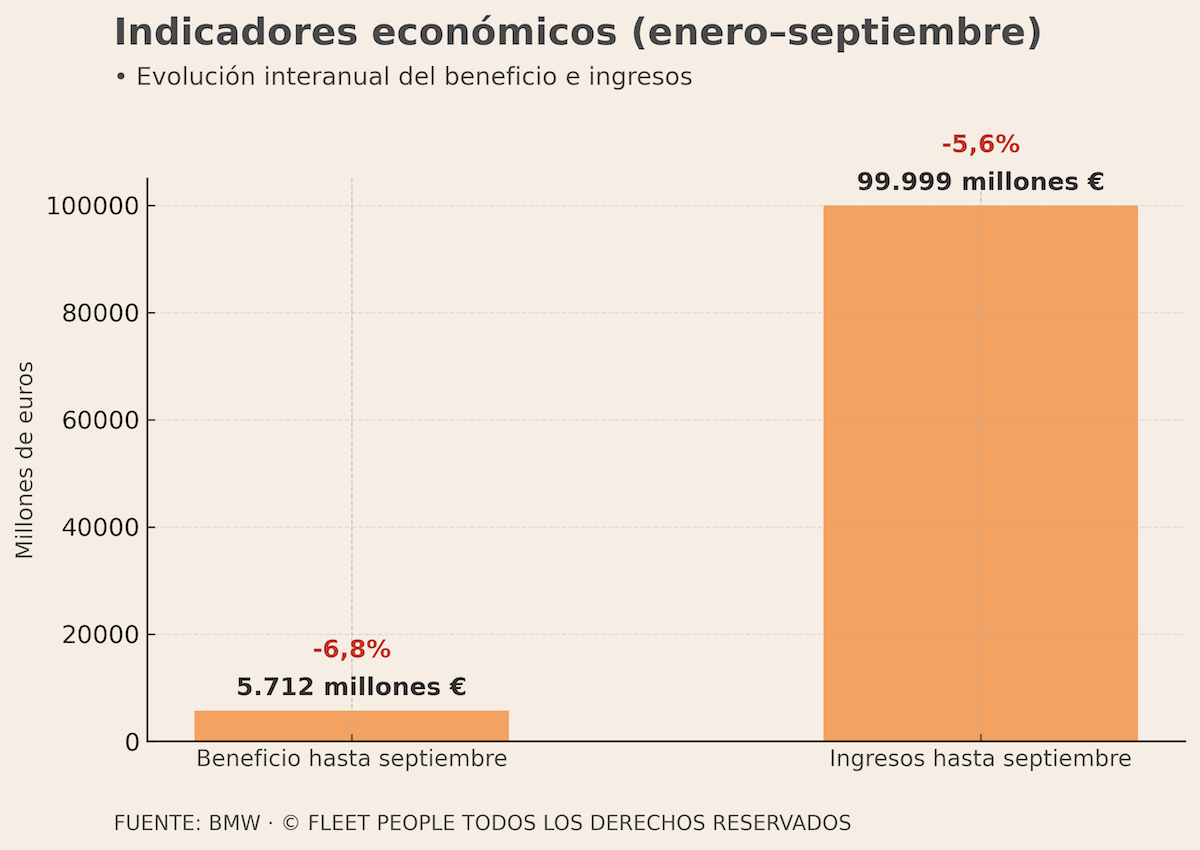 El fabricante alemán de automóviles BMW Group ha cerrado los nueve primeros meses de este ejercicio con un beneficio neto de 5.712 millones de euros, lo que representa una caída del 6,8 % respecto de los 6.132 millones registrados en el mismo periodo de 2024, según los resultados financieros comunicados por la compañía.