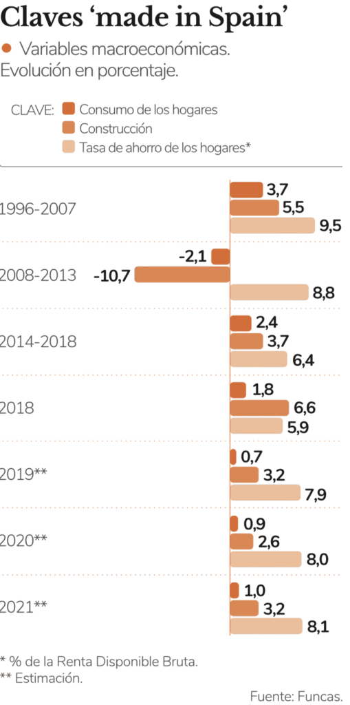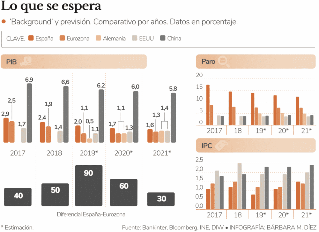 Para España, las previsiones económicas que se manejan no son tan catastrofistas (dependiendo de quién las realice, claro), pero ponen de manifiesto que la recuperación que se ha experimentado en los últimos años no va seguir la misma línea en los próximos meses. Así, a mediados del pasado mes de octubre, el Gobierno revisó a la baja su previsión de crecimiento del PIB para 2019, hasta el 2,1% (una décima menos) y el que viene (1,8%). Esta rebaja está en línea con los movimientos realizados por organismos como Funcas, CaixaBank, la agencia de calificación S&P o el propio Banco de España.