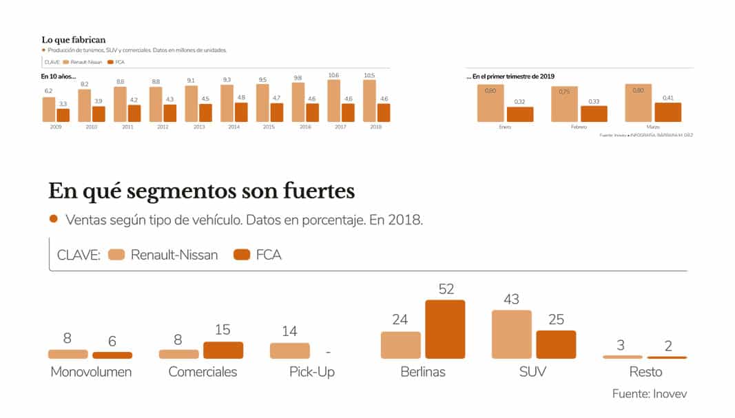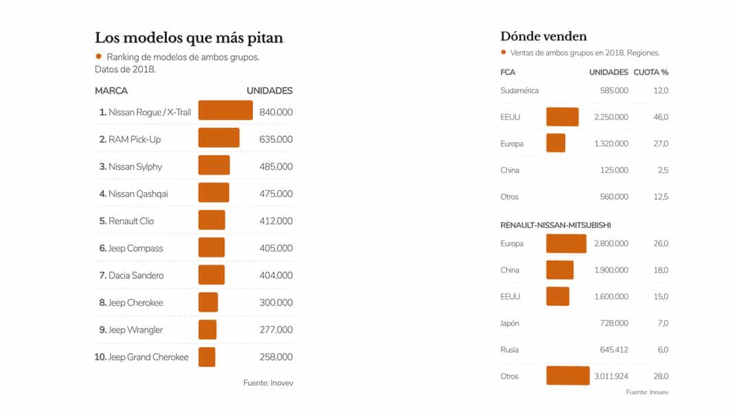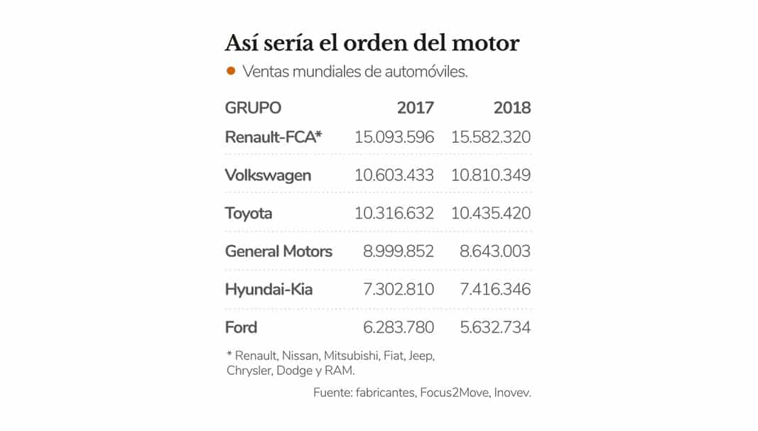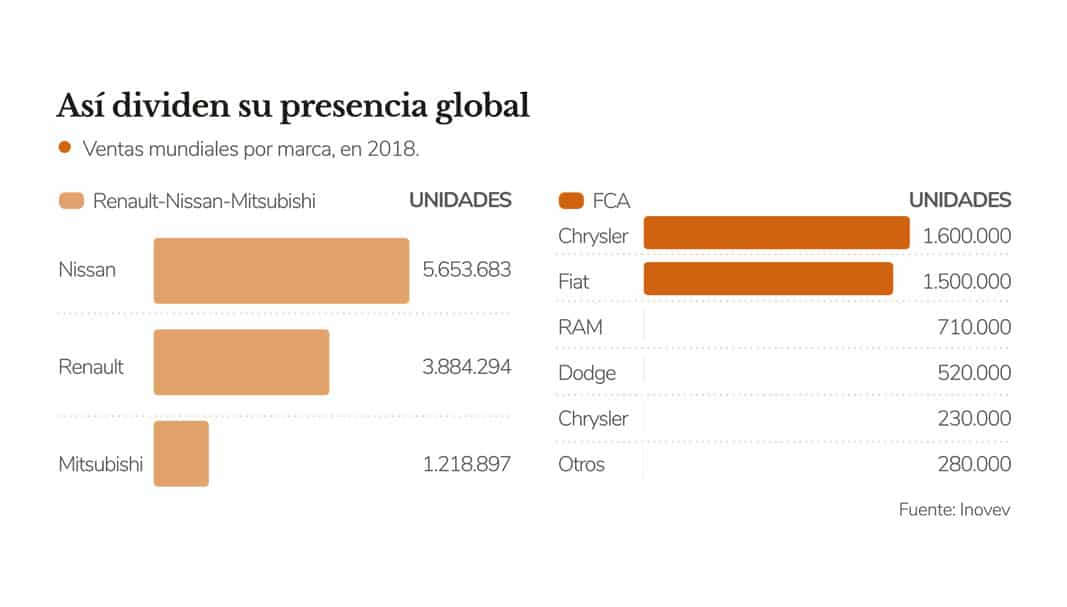 La oferta, según todos los analistas de un lado y otro del Atlántico, desde Bloomberg a Standard & Poor’s resultaba ser un win-win para ambas compañías creando un gigante mundial, sólo por detrás del Grupo Volkswagen y de Toyota Motor Corporation. Una fusión al 50% crearía un grupo automovilístico con 8,7 millones de unidades al año de todas sus marcas. Renault aportaría la propia enseña del rombo, Dacia, Alpine, Lada, Samsung, Jinbei y Huasong; mientras que FCA sumaría Fiat, Abarth, Alfa Romeo, Maserati, Jeep, Chrysler, Dodge y RAM (incluida en Fiat Professional, la unidad de vehículos comerciales del grupo) y Mopar y SRT, como filiales de customización y de altas prestaciones, respectivamente. El nuevo grupo generaría unas ventas anuales por valor de 170.000 millones de euros, con un beneficio de 8.000 millones.