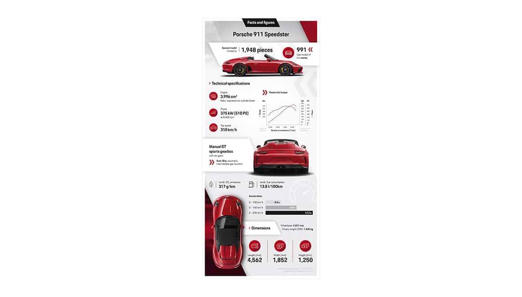 El seis cilindros bóxer atmosférico tiene el pico de potencia máxima a 8.400 rpm y puede girar hasta las 9.000 revoluciones, mientras el par máximo de este propulsor es de 470 Nm a 6.250 rpm. Con estos argumentos, el 911 Speedster acelera de 0 a 100 km/h en 4 segundos y llega a una velocidad punta de 310 km/h.