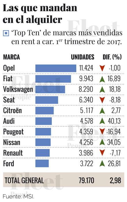 Las empresas de alquiler matricularon, según datos de MSI, un total de 11.424 unidades en España a lo largo del primer cuarto del año y con la vista puesta en la pasada Semana Santa, lo que representa una disminución del 1% y le sirvió para alcanzar una cuota en el canal del 14,43%. El olimpo de las marcas más vendidas lo completaron Fiat, con 9.943 unidades entregadas, un 16,89% más y un 12,5% de cuota, y Volkswagen, con 8.290 unidades, un 18,8% más y una penetración del 10,47%.