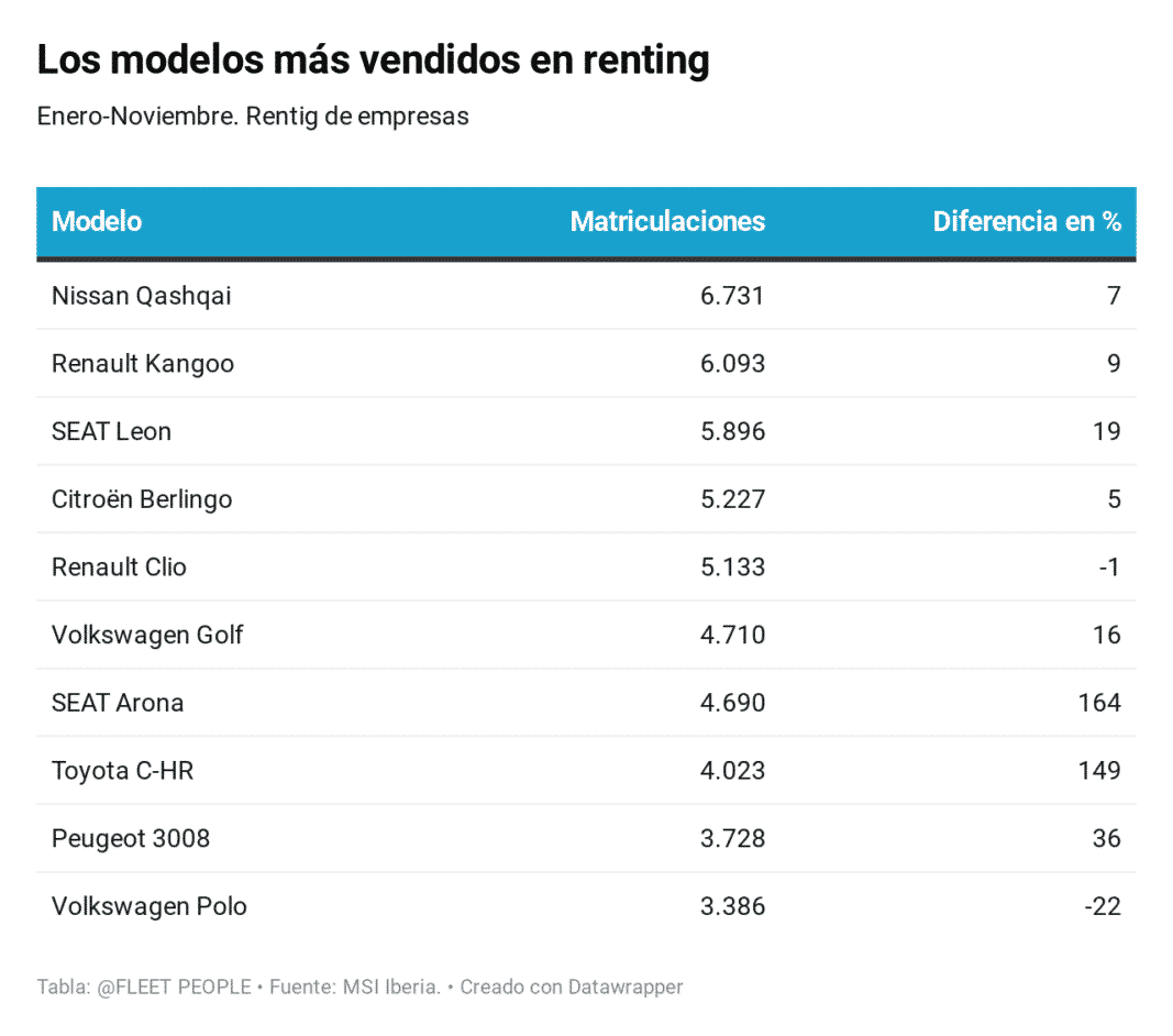 Por modelos, Nissan Qashqai, Renault Kangoo y Seat León encabezan las matriculaciones hasta noviembre de los preferidos por los clientes de este servicio de alquiler.