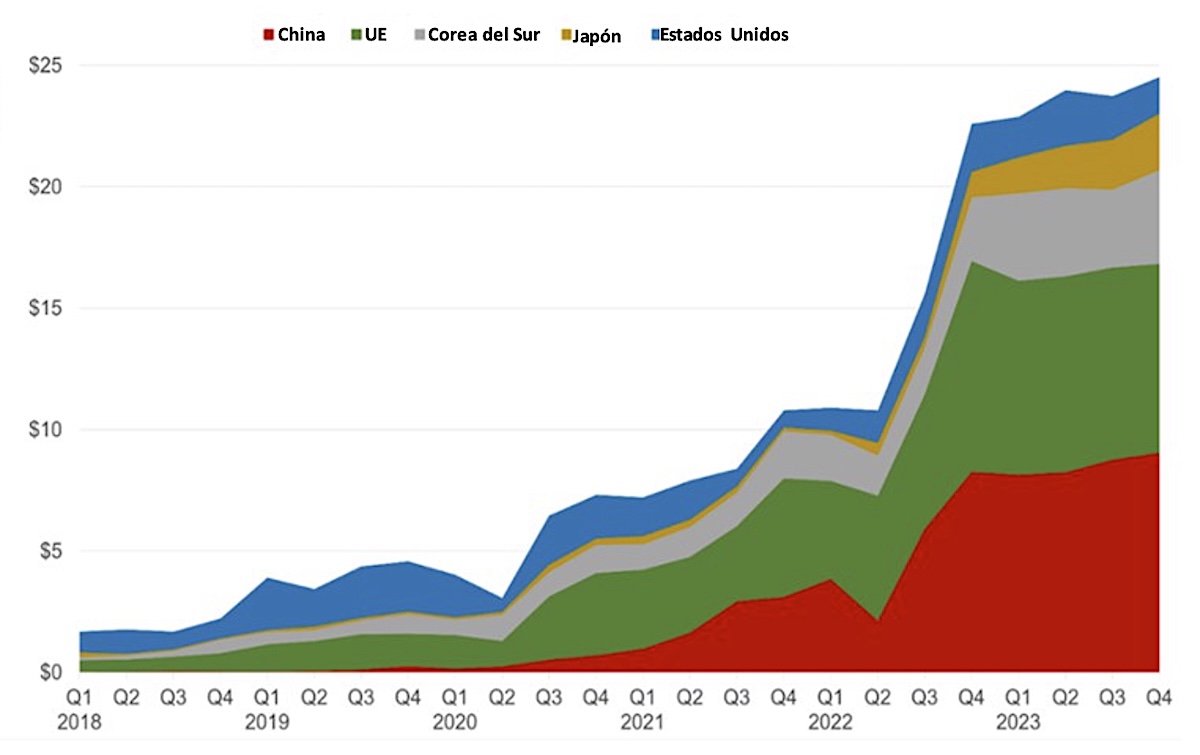 La competencia china es particularmente acentuada en la UE, que en 2023 fue la destinataria de casi el 55 por 100 de las exportaciones del gigante asiático, que han crecido de forma vertiginosa, ya que en 2019 sólo suponían el 1 por 100. Esto supone que China dirige hacia la UE el 40 por 100 de sus exportaciones de EV, mientras que apenas comercia con los EE.UU. (Bencivelli et al.,2024).