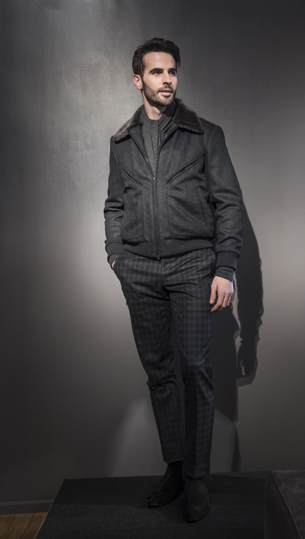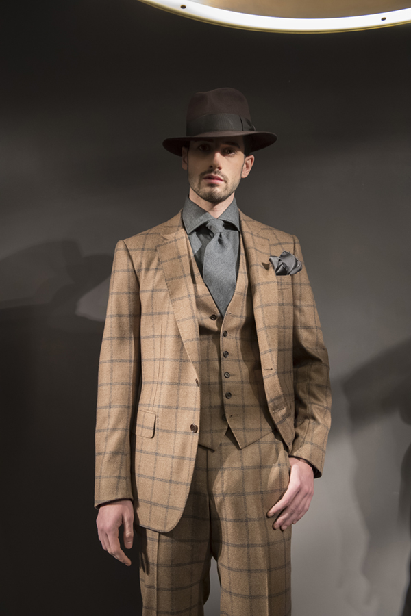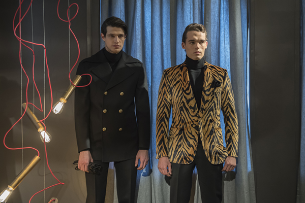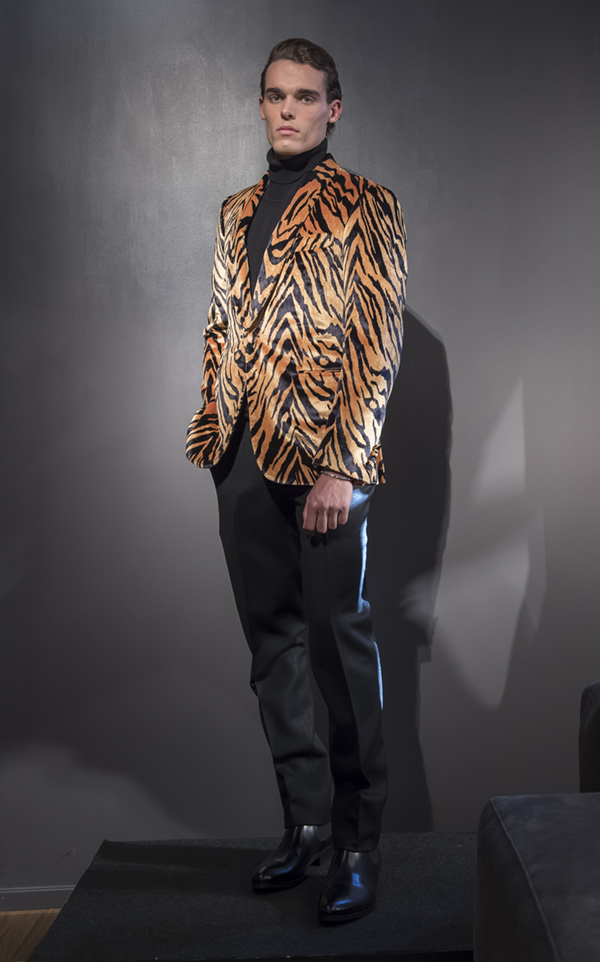 La sastrería presenta un hombre moderno con un gusto sofisticado y exquisito, proponiendo trajes de tres piezas, chaquetas de satén de seda, jerséis de cuello alto o solapas en pico. Además, destaca el traje de dos piezas en terciopelo con estampado de tigre, un diseño atrevido pero con tintes muy sofisticados.