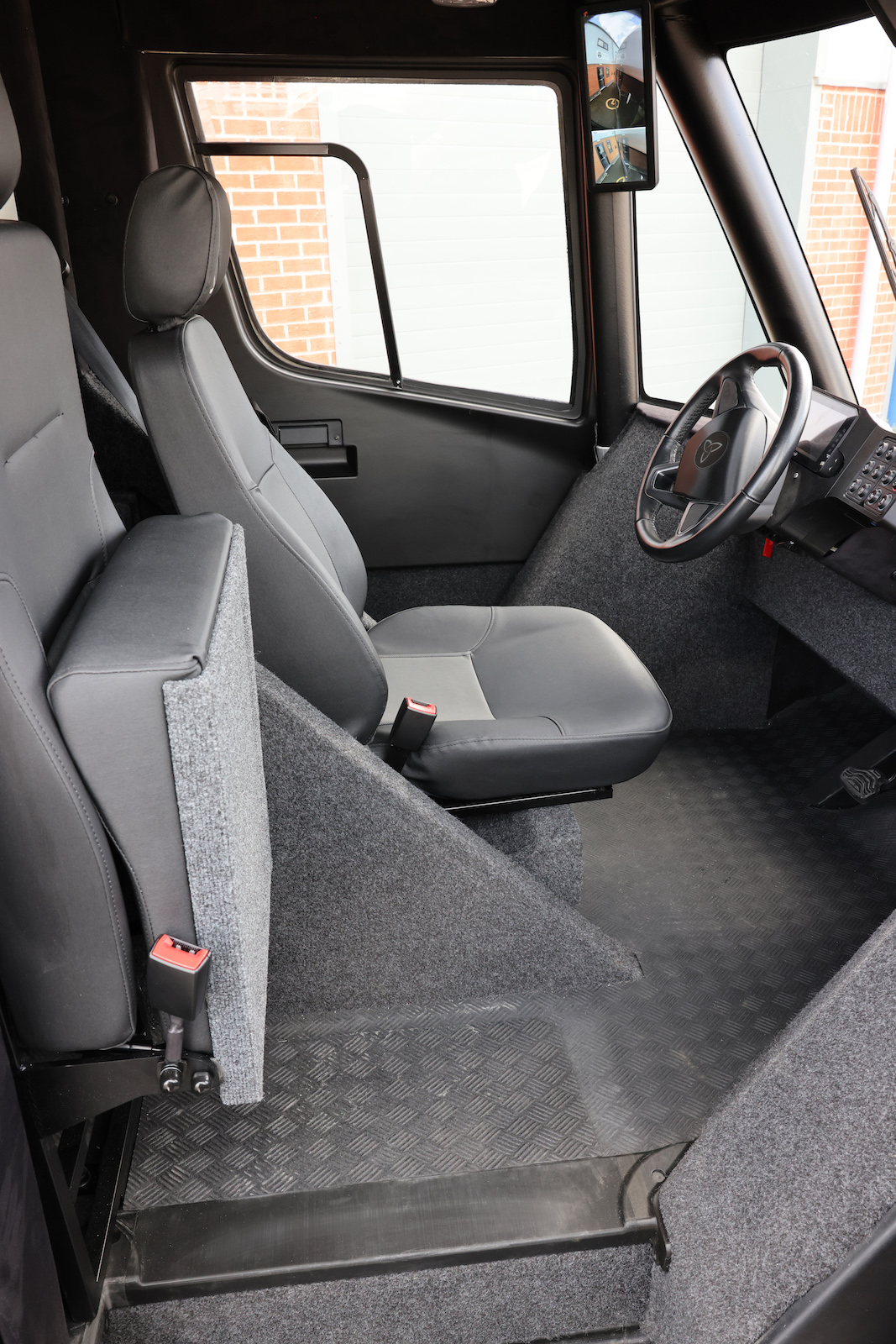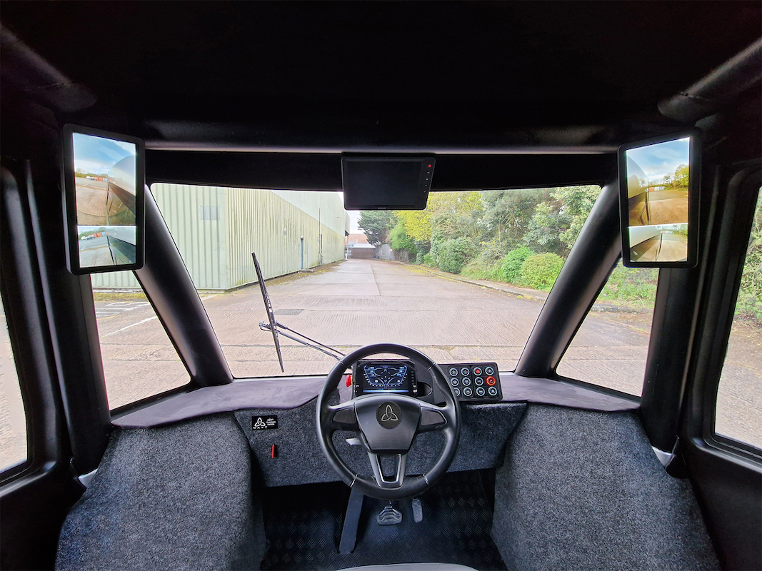 El eCV1 cuenta con una posición de conducción central, la cabina se puede configurar como un vehículo de una, dos o tres plazas y dispone de una amplia superficie acristalada.