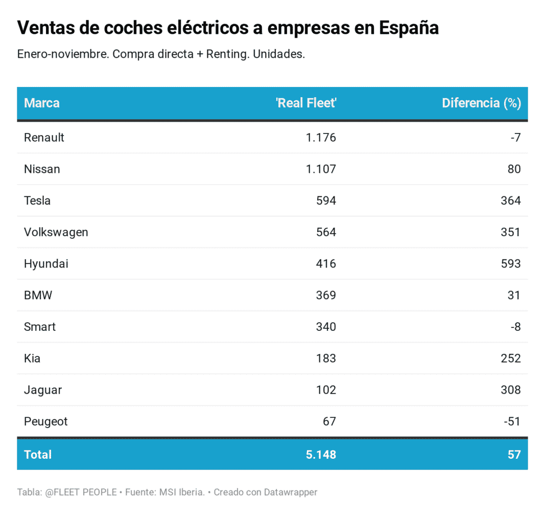 En concreto, en noviembre se vendieron 4.201 vehículos de este tipo en renting puro —neto, sin alquiladoras—, lo que supuso un crecimiento del 197%, a lo que se sumaron 1.590 compras directas por parte de empresas, un 41,7% más, para conformar ese mercado ‘Real Fleet’ que aumentó un 128%.