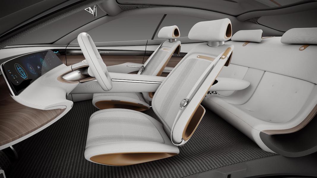 Inspirado en la aeronáutica, un sistema de ventilación de aire bidireccional sopla aire sobre la superficie curvada de la carrocería. La madera revitalizada y los tejidos de alta tecnología son utilizados. Una pantalla flotante panorámica, con tecnología haptic (tecnología táctil sensorial), ubicada frente al conductor, proporciona acceso a los mandos del climatizador y otras configuraciones del vehículo.
