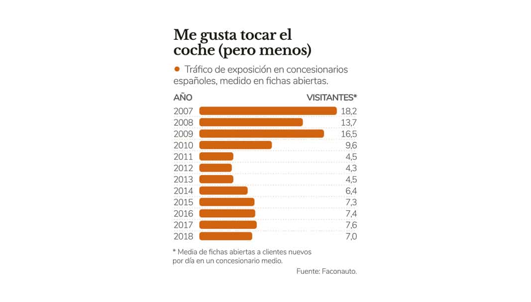 Caída del 62% del tráfico desde 2007Los datos no mienten, y para muestra un botón. En 2007, último año antes de que azotara en España y en todo el mundo la crisis económica, un concesionario español medio contabilizaba una media de 18,2 fichas abiertas a clientes nuevos por cada día. El dato ha caído hasta siete fichas al día en 2018, según datos de Faconauto. El registro del tráfico de exposición y de contactos comerciales en los puntos de venta pone de manifiesto que 2007 fue el punto álgido de las matriculaciones de vehículos en España. Los concesionarios casi despachaban a los clientes y no tenían tiempo literal ni casi tampoco ganas de vender más. No obstante, ese momento top fue bajando a medida que los devastadores efectos de la crisis, con la pérdida de empleos, menor poder adquisitivo de las familias y, sobre todo, con la incertidumbre ante la posible pérdida del puesto de trabajo Los peores momentos para los concesionarios, en términos de visitas de clientes a las exposiciones, se concentraron en 2011, 2012 y 2013, siendo 2012 el peor de la serie histórica, con 4,3 fichas abiertas de posibles compradores nuevos por cada día, más de cuatro veces menos que en 2007. La crisis fue una razón de peso para que los puntos de venta vieran cómo los clientes ya no los visitaban con tanta fluidez, pero las cifras, aunque se han recuperado un poco en los últimos años, siguen estando muy por debajo de los niveles máximos. Esto se explica, principalmente, por el cambio en los hábitos de compra de los consumidores, que ya se informan, en su mayor parte, en Internet para casi ir solo a cerrar la compra al concesionario. |