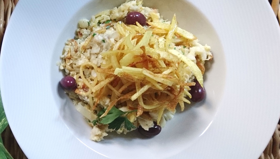 1/2 kg de bacalao fresco sin piel ni espinas, 3 patatas, 2 huevos, 2 cebollas medianas, 1 diente de ajo, Sal, pimienta y Aceite de Oliva, Perejil fresco picado, Aceitunas negras (opcionales)
