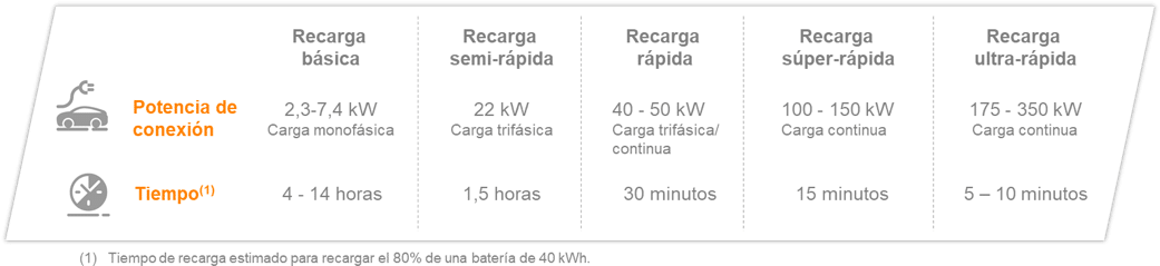 Existen diferentes tipos de recarga en función de la potencia del punto de suministro, que, junto con las características del propio vehículo, determina la velocidad de llenado de la batería. Así, en un punto de recarga ultra-rápida, que va desde los 175 kW hasta los 350 kW, se puede recargar el 80% de una batería de 40 kWh en unos 5-10 minutos, para recorrer aproximadamente 270 km. En un punto rápido, de 50 kW, este tiempo es de ~30 minutos, mientras que en uno semi-rápido, de 22 kW, se necesita 1,5 horas.