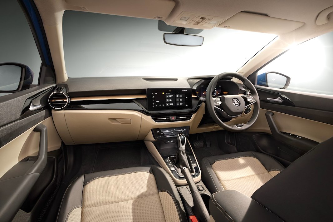 En el interior, el Slavia se basa en el último concepto de diseño de los modelos europeos de Skoda con una pantalla independiente de infoentretenimiento de hasta 10 pulgadas. También presenta unas rejillas de ventilación redondas.