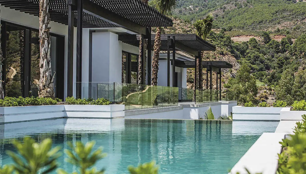 Además de una piscina exterior modelo infinity que asoma a los valles de la finca con vistas a Gibraltar y al Mediterráneo, las villas cuentan con una interior, rodeada de enormes ventanales. Su agua está climatizada, y cuenta con un sistema de cromoterapia, que se activa por voz o manualmente, y que utiliza los colores para ajustar las vibraciones del cuerpo a las frecuencias, lo que se traduce en un beneficio físico y mental. Cada color posee frecuencias de una vibración específica, y cada vibración se relaciona con diferentes síntomas físicos. La cromoterapia trabaja en diversos puntos de energía para ayudar al cuerpo a restablecer su equilibrio natural.